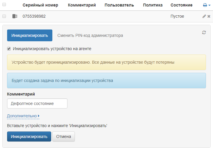 - Нажмите Инициализировать, если PIN-код администратора на устройстве совпадает с сохраненным в хранилище системы. После выполнения задачи PIN-код администратора на устройстве и в базе не изменится, PIN-код пользователя будет сброшен на значение, указанное в Типе устройства.