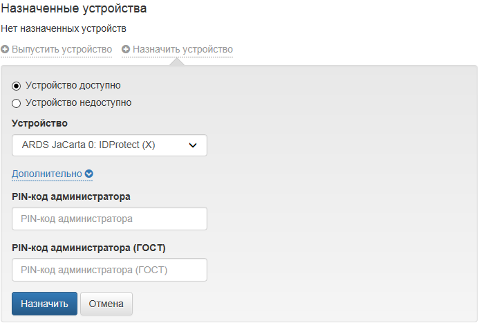 Если PIN-код администратора не соответствует значению, заданному производителем (или значению, указанному в Типе устройства), то укажите PIN-код администратора для каждой области в разделе Дополнительно. Нажмите Назначить.