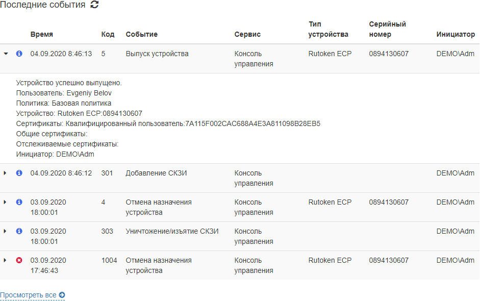 Для просмотра полного списка событий и перехода в раздел Журнал нажмите Просмотреть все.