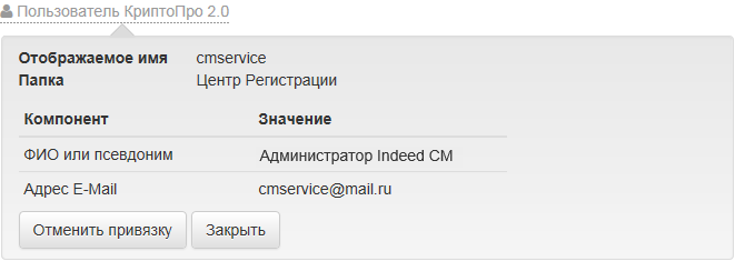 - Установленную привязку можно отменить. Для этого нажмите Пользователь КриптоПро 2.0 и затем Отменить привязку.