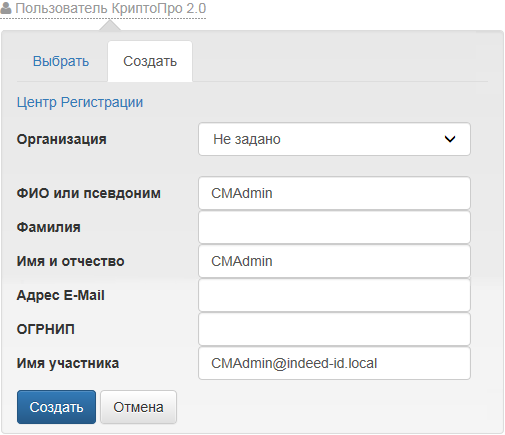 - Нажмите Пользователь КриптоПро 2.0 и перейдите на вкладку Создать. Вы можете отредактировать данные создаваемого пользователя. Перечень полей для редактирования зависит от настроек используемого удостоверяющего центра КриптоПро.