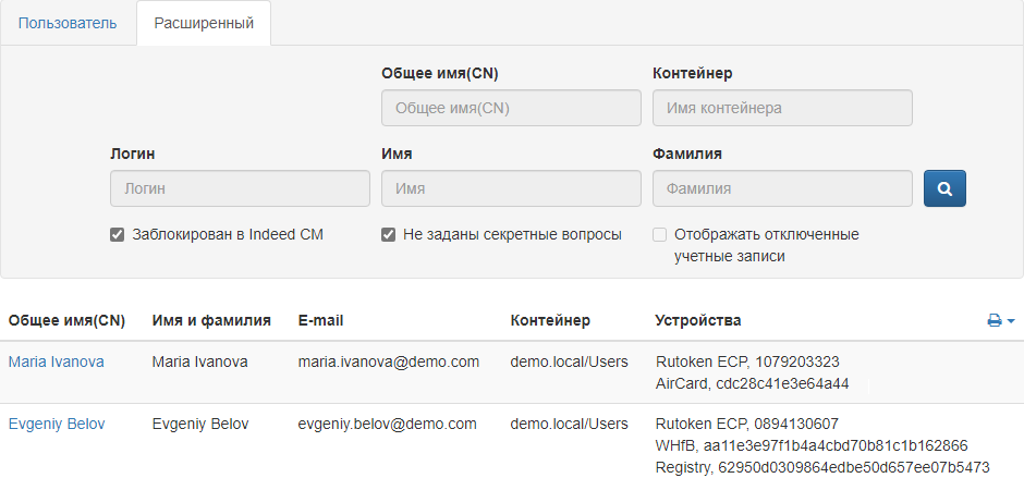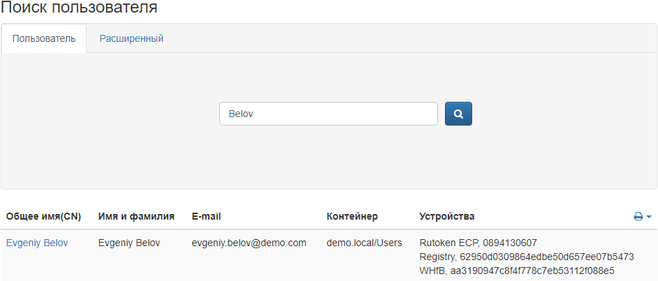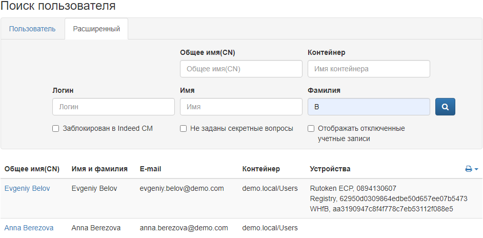 Раздел Пользователи открывается автоматически при переходе на страницу Консоли управления. Для выполнения действия с устройством, имеющего отношение к пользователю системы, необходимо выполнить поиск нужного пользователя среди всех пользователей каталога.