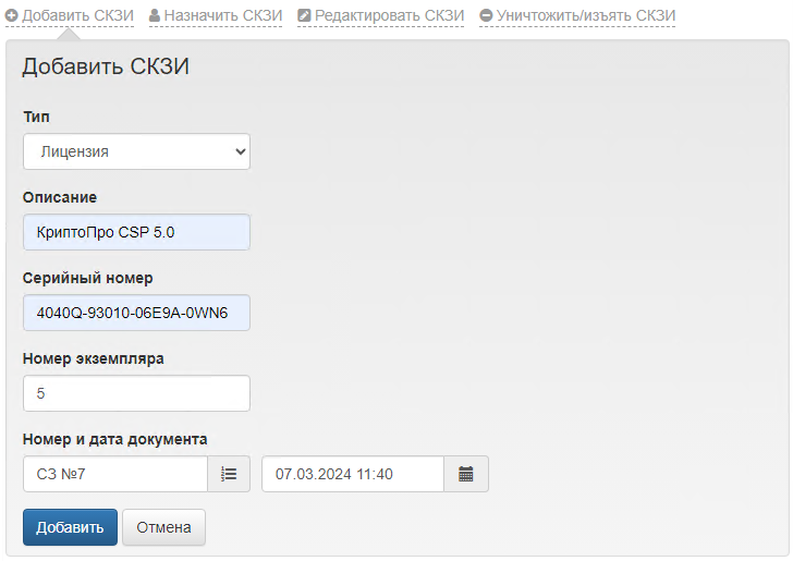 Номер документа, на основании которого добавляется СКЗИ, можно указать