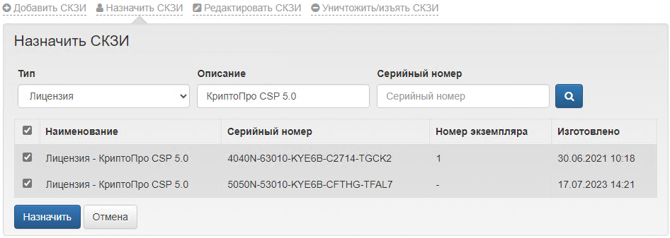 - Нажмите Назначить СКЗИ и задайте фильтры поиска: тип, описание, серийный номер.