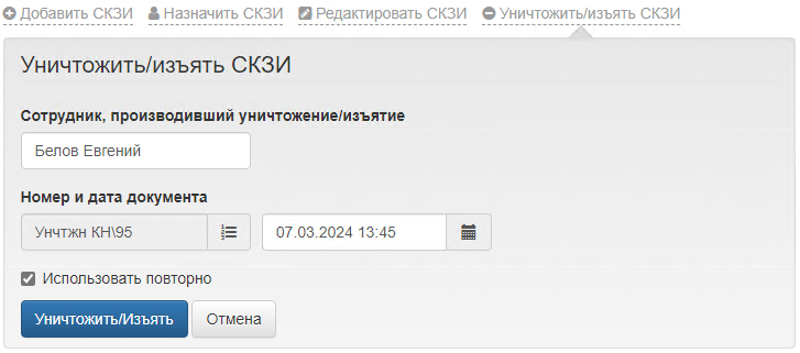 Выберите СКЗИ и нажмите Уничтожить/изъять СКЗИ.