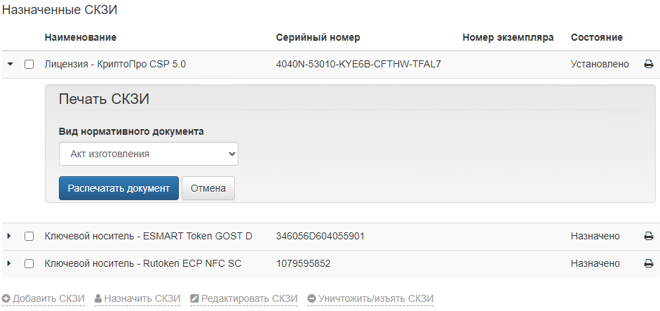 - Выберите СКЗИ и нажмите Редактировать СКЗИ.