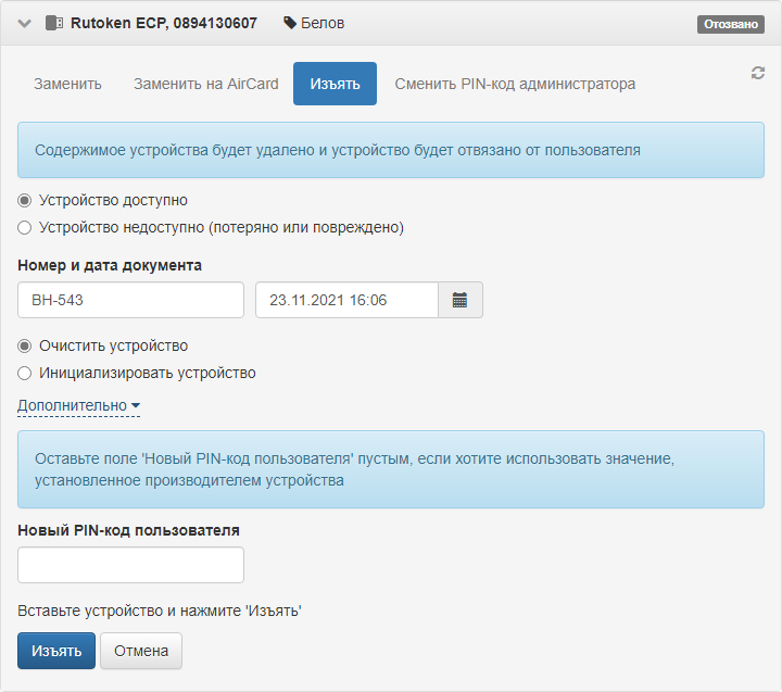 Отозванное устройство пользователя остается закрепленным за ним. Такое устройство можно заменить (см. раздел Замена устройства) или изъять.