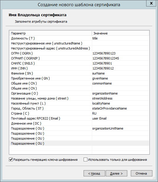 - Заполните атрибуты сертификата для построения Имени Владельца сертификата, установите опцию Разрешить генерацию ключа шифрования, если требуется, и нажмите Далее.