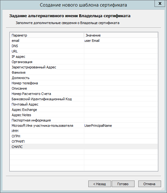 - Задайте альтернативное имя владельца сертификата и нажмите Готово.