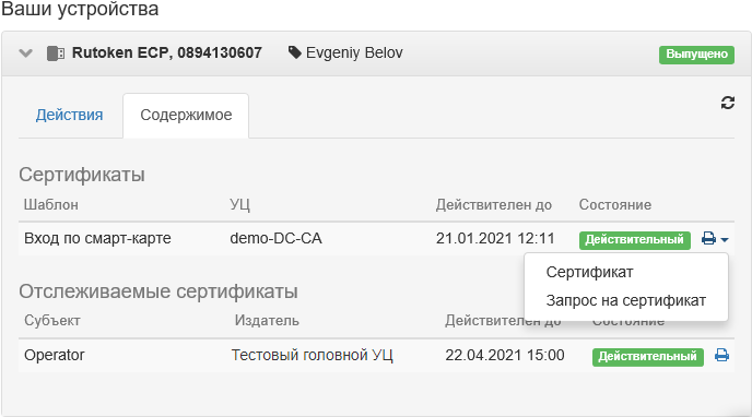 Если в настройках системы разрешено отображение содержимого устройства в Cервисе самообслуживания, то в свойствах выпущенного устройства будет доступна вкладка Содержимое с информацией о сертификатах на устройстве.