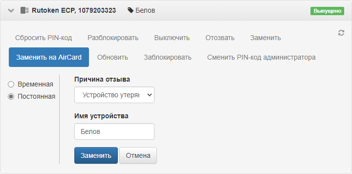 Заменяемое устройство отзывается, вместо него выпускается новое. На новое устройство записываются все данные заменяемого устройства (ключевые пары, сертификаты). Сертификаты на заменяемом устройстве отзываются без возможности восстановления.