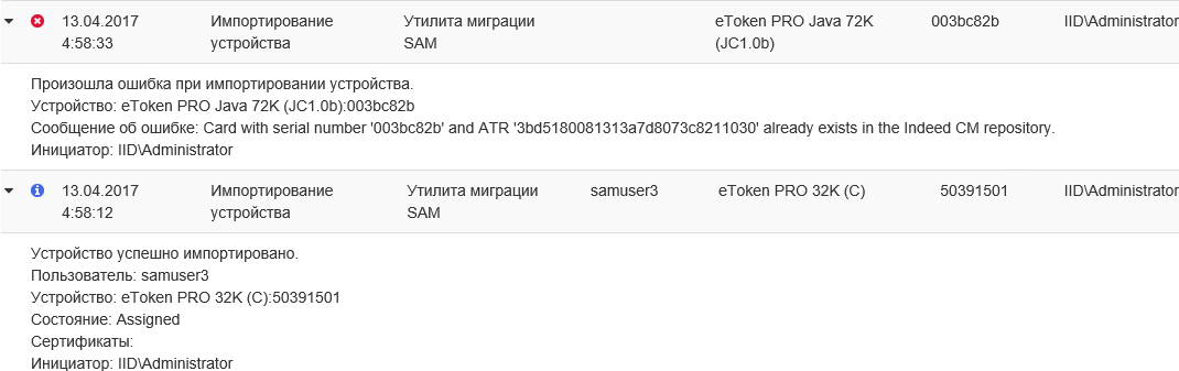 Если при работе утилиты IndeedCM.Migrate.SAM.exe с хранилищем SAM встречается устройство с моделью и product name, которые не указаны в секции tokenTypes, то такие устройства не будут перенесены в хранилище Indeed CM, а утилита выведет соответствующую ошибку.