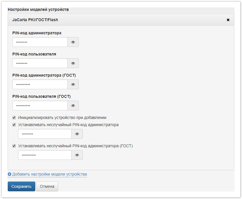 Indeed CM позволяет установить отдельные параметры для добавления устройств различных моделей. Функциональность поддерживается для устройств Рутокен, JaCarta, eToken PRO Java 72K и IDPrime MD.