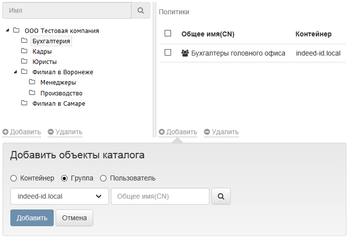Чтобы добавить объекты в узел, в правой части окна редактирования организационной структуры нажмите Добавить. При создании структуры используются объекты каталога пользователей.