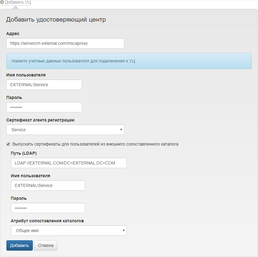 DOMAIN\Usernameи пароль сервисной учетной записи, обладающей сертификатом Агент регистрации (Enrollment Agent). - Нажмите Добавить.