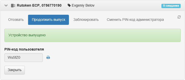 8. Если в разделе Выпуск политики использования устройств задана опция Установить случайный PIN-код пользователя, то после выпуска устройства отобразится PIN-код пользователя.