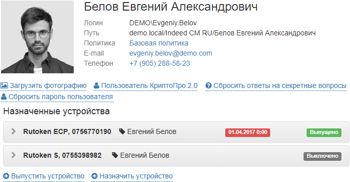 При временной замене в карточке пользователя отображаются два устройства: основное устройство выключено, новое устройство выпущено на определенный срок.