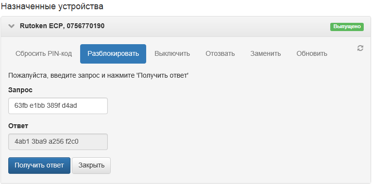 1. Когда число попыток ввода PIN-кода исчерпано, пользователь получает сообщение, что его устройство заблокировано. Вместе с сообщением пользователь получает уникальный код-запрос из 16 символов.