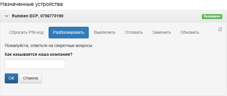 Онлайн-разблокировка осуществляется пользователем в окне входа ОС Windows. Пользователь отвечает на секретные вопросы, задает и подтверждает новый PIN-код, после чего устройство разблокируется.