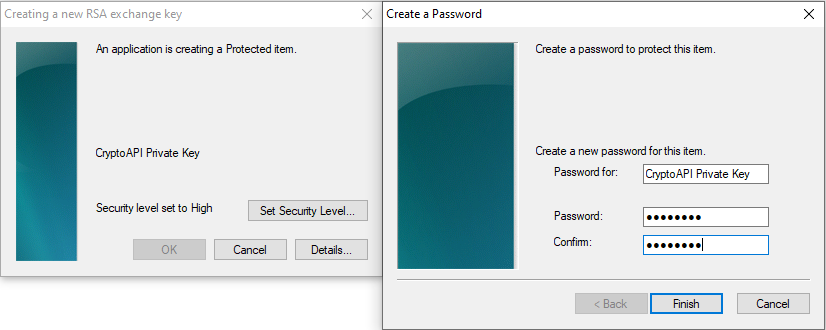 - Создайте пароль для контейнера закрытого ключа в окне создания приватного RSA-ключа.