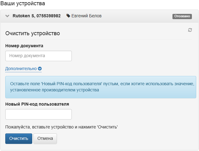 Укажите Новый PIN-код пользователя, который должен быть установлен на устройстве после его очистки или оставьте это поле пустым для установки PIN-кода по умолчанию. Нажмите Очистить.