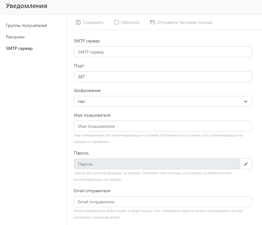 Для работы системы уведомлений укажите почтовые настройки: перейдите в раздел SMTP сервер, введите адрес почтового сервера, порт, данные для авторизации и сохраните изменения.
