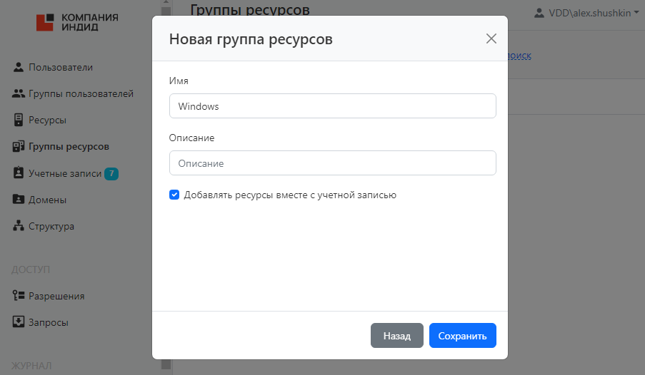 - Во время добавления ресурса в группу есть параметр Добавлять ресурсы вместе с учетной записью от которого зависит способ работы группы ресурсов. Этот параметр влияет на то, как будет выдаваться разрешение на группу ресурсов.