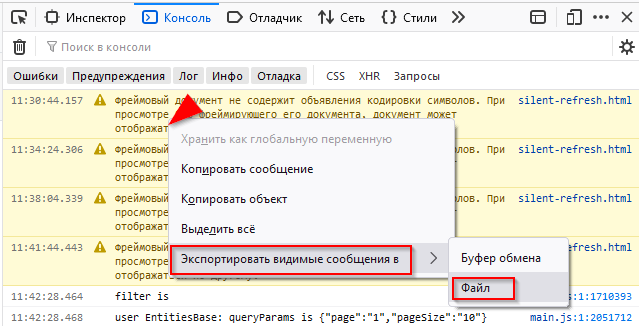 - Перейдите во вкладку Консоль, нажмите правой кнопкой по сообщениям консоли, выберите пункт Экспортировать видимые сообщения в → Файл и сохраните файл.