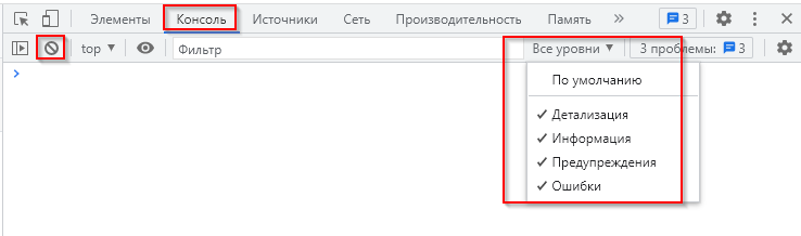 для очистки консоли, включите опции Детализация, Информация, Предупреждения, Ошибки: