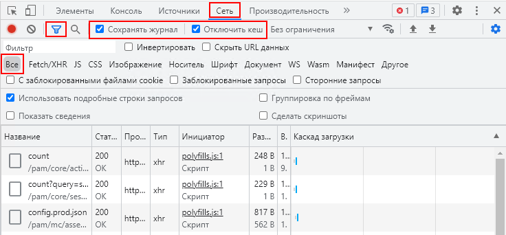 - Во вкладке Сеть включите настройки Сохранять журнал, Отключить кеш, тип фильтра Все, как на скриншоте ниже: