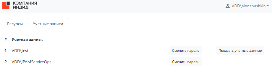 Если пользователь имеет разрешение, в котором включена опция Разрешить изменение учетных данных, то в разделе Учетные записи будет доступно редактирование пароля учетной записи.