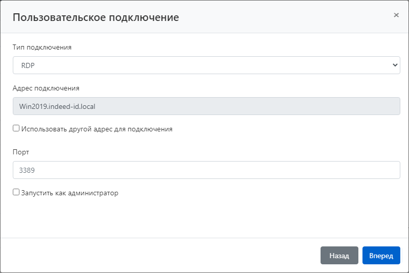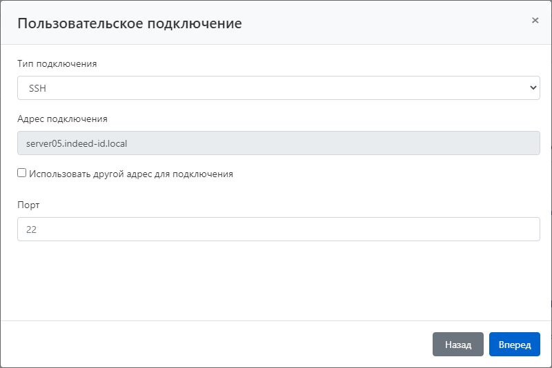 | Адрес пользовательского подключения | Необязательный | Указывается IP-адрес или DNS для переопределения адреса подключения при подключении к ресурсу. |