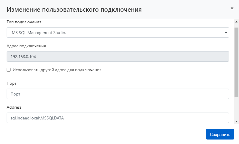 - Если адрес подключения экземпляра MS SQL Server отличается от DNS или IP-адреса, то укажите его.