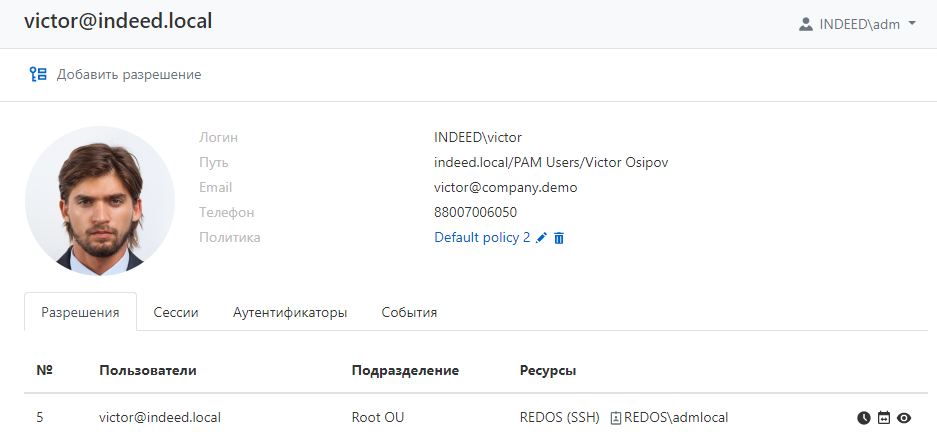 - Ресурсы — ресурсы, на которых может быть открыта RDP, SSH или WEB-сессия от имени учетной записи, указанной в разрешении. Рядом с именем ресурса указана привилегированная учетная запись, которая используется для доступа к ресурсу.