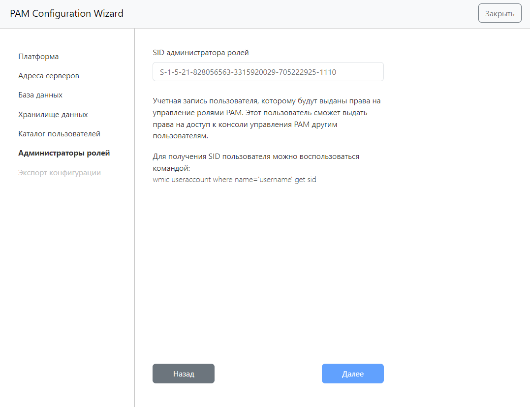 В следующем окне укажите SID администратора ролей и нажмите Далее.