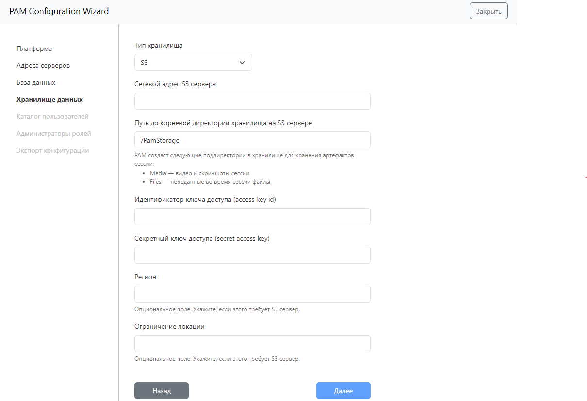 При выборе S3 заполните поля: Сетевой адрес S3 сервера, Путь до корневой директории хранилища на S3 сервере, Идентификатор ключа доступа (access key id), Секретный ключ доступа (secret access key). При необходимости заполните опциональные поля: Регион, Ограничение локации.