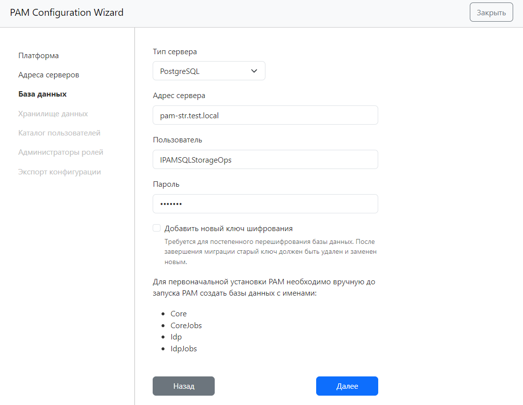 В следующем окне укажите информацию о базе данных: Тип сервера, Адрес сервера, введите логин и пароль учетной записи для работы с базами данных в поля Пользователь и Пароль. Оставьте опцию Добавить новый ключ шифрования выключенной.