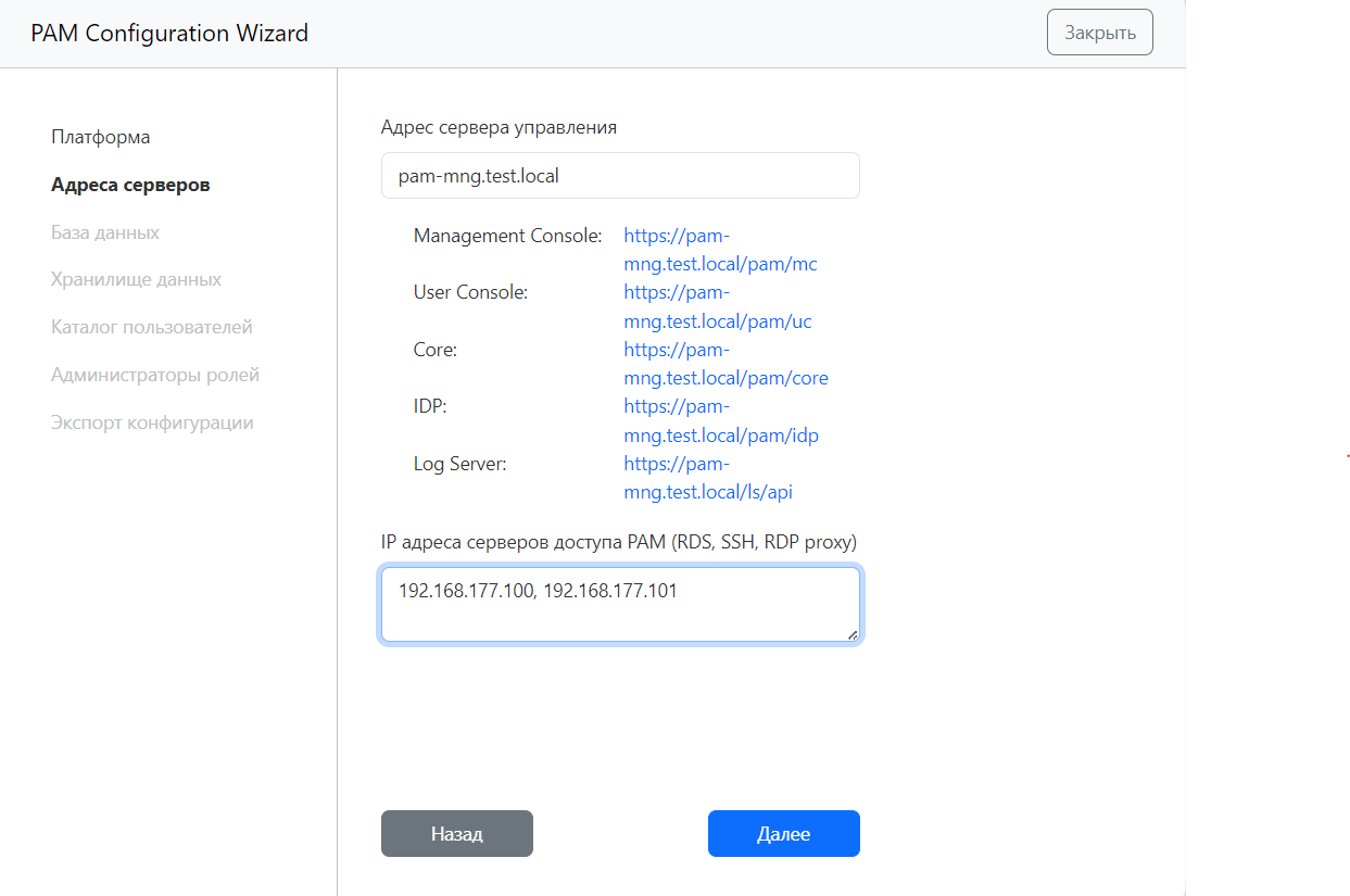Заполните поле IP-адреса серверов доступа PAM.
