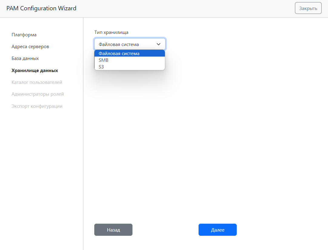 Выберите Тип хранилища.