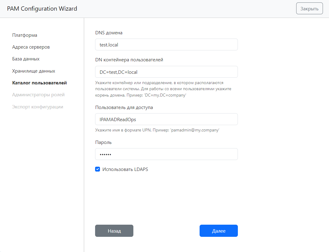 В следующем окне укажите DNS домена, DN контейнера каталога пользователей, введите логин и пароль учетной записи для чтения каталога пользователей, и отметьте требуется ли использовать протокол LDAPS при чтении каталога (по умолчанию используется протокол LDAP) и нажмите Далее.