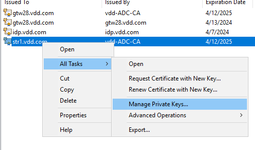 - Открыть меню сертификата Все задачи (All Tasks) → Управление закрытыми ключами (Manage Private Keys...).