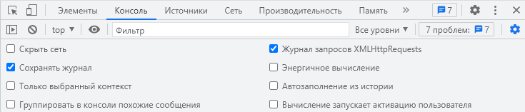 (Настройки консоли) и отметьте опции Сохранять журнал, Журнал запросов XMLHttpRequests: