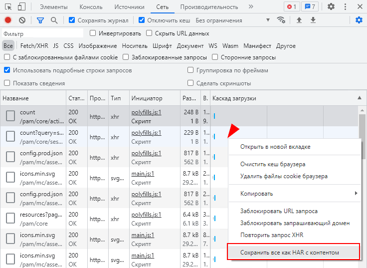 , выберите пункт Сохранить всё как HAR и сохраните файл: