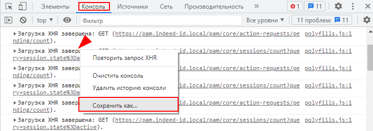 - Перейдите во вкладку Консоль, нажмите правой кнопкой по сообщениям консоли, выберите пункт Сохранить как и сохраните файл: