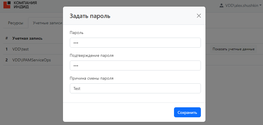 Если пользователь имеет разрешение, в котором включена опция Разрешить просмотр учетных данных, то в разделе Учетные записи будут доступны соответствующие данные. Для просмотра нажмите Показать учетные данные, введите причину просмотра и подтвердите свои действия.