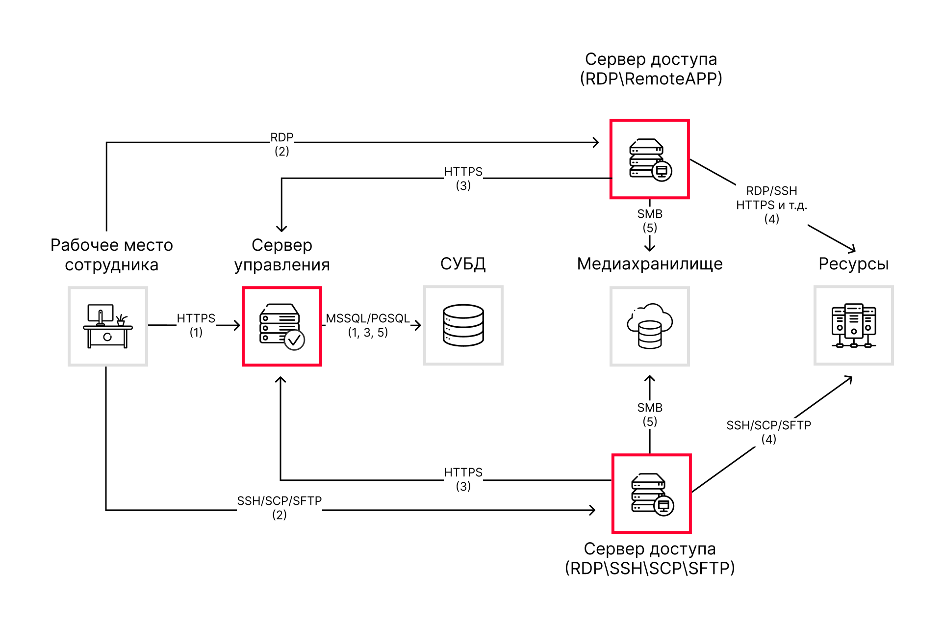 - Подключение к серверу доступа (RDP\RemoteApp) при помощи RDP-файла, Indeed PAM Desktop Console или подключение к серверу доступа (RDP\SSH\SCP\SFTP) при помощи RDP-файла или отдельного SSH-клиента.
