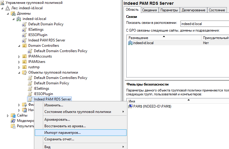2. Настройте фильтры безопасности объекта групповой политики для применения только к объекту сервера Indeed PAM Gateway.