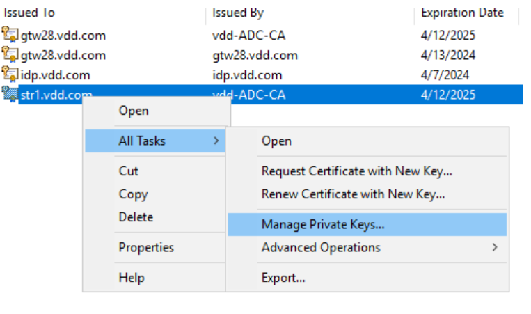 Нажмите правой кнопкой мыши на сертификат и выберите All Tasks (Все задачи) → Manage Private Keys (Управление закрытыми ключами*).