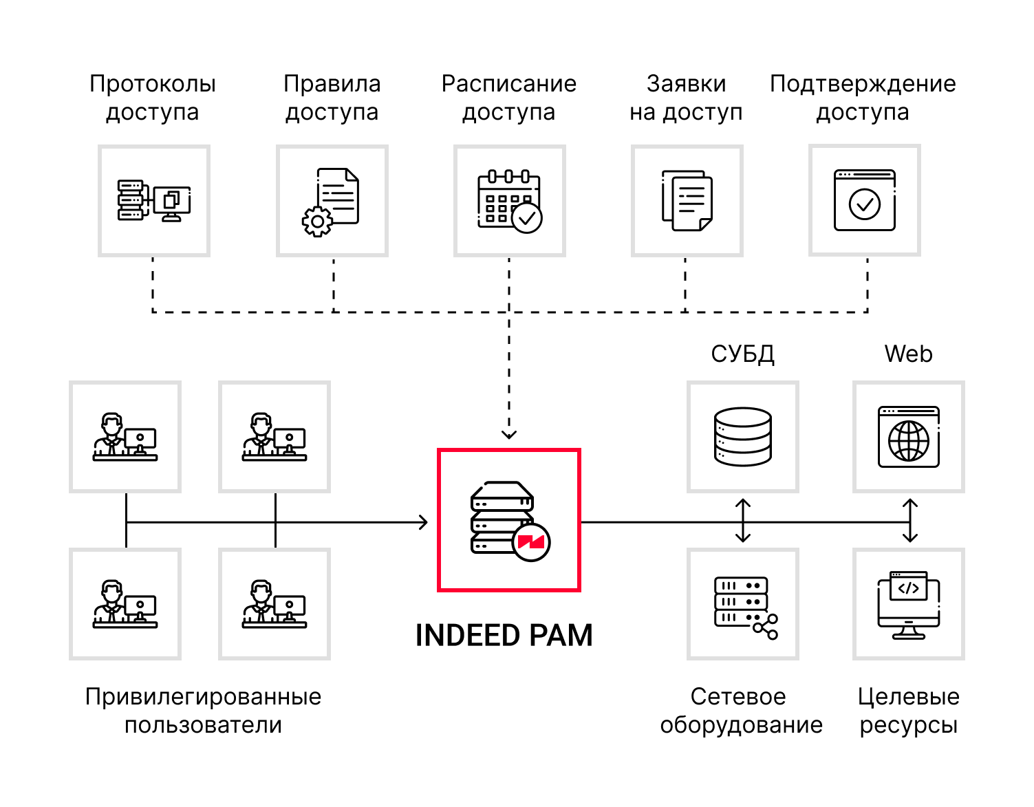 Программный комплекс Indeed Privileged Access Manager (Indeed PAM) — продукт для управления доступом привилегированных пользователей к ИТ-системам компании.